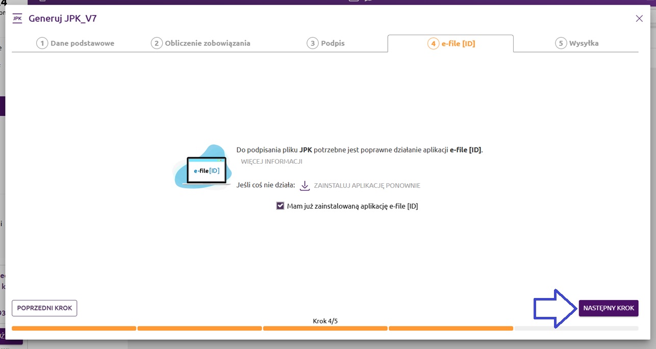 Po poprawnej instalacji e-file [ID] lub zaznaczeniu checkboxa informującego o zainstalowaniu e-file [ID], wybieramy przycisk ‘Następny krok’.