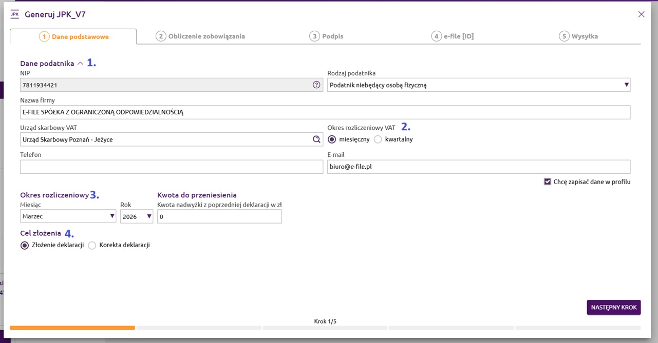 W pierwszym kroku kreatora pliku JPK_V7 wyświetlą nam się dane podatnika (1), czyli dane klienta, którego profil mamy aktualnie otwarty w aplikacji. W tym oknie możemy dopisać dodatkowe dane do kontaktu dla Urzędu Skarbowego: nr telefonu i adres e-mail oraz zaznaczyć, jaki firma posiada okres rozliczeniowy VAT - miesięczny czy kwartalny (2) i wskazać okres rozliczeniowy za jaki chcemy utworzyć plik JPK_V7 (3). Na końcu zaznaczamy cel złożenia deklaracji (4) - czy ma być to złożenie zeznania, czy korekta zeznania.