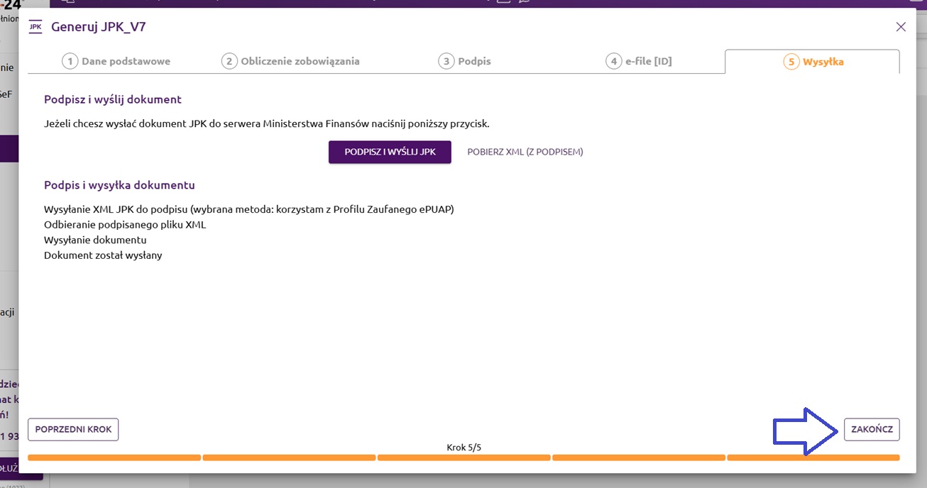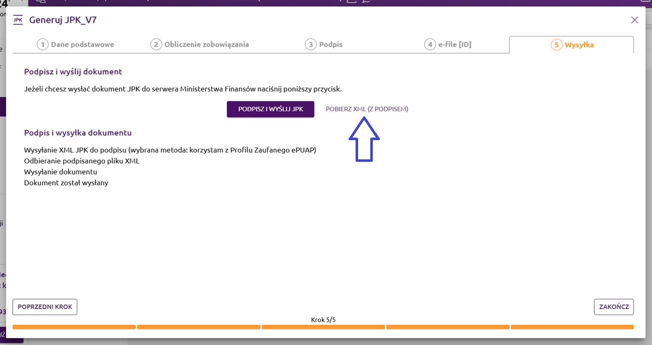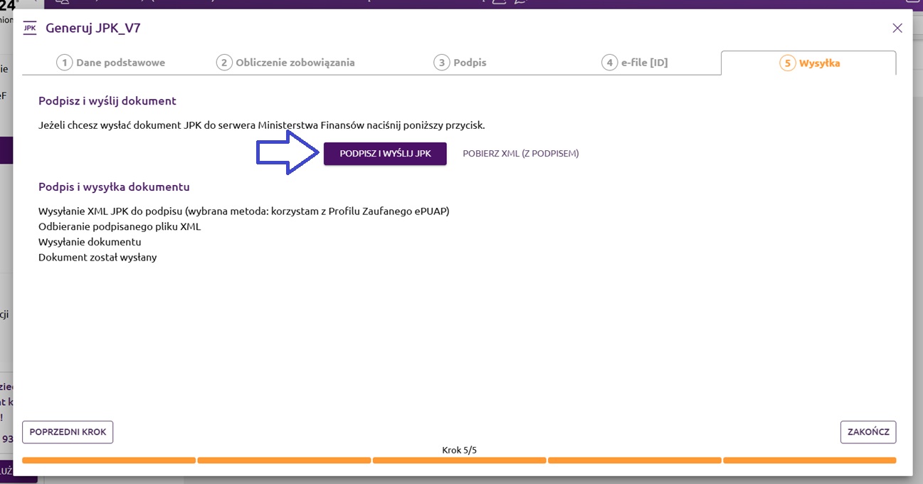 W ostatnim kroku można podpisać i wysłać wygenerowany plik XML JPK_V7. Po wybraniu opcji 'Podpisz i wyślij JPK' kreator wyświetli nam kolejne kroki podpisu, a po podpisaniu dokumentu program wyśle nasz plik na serwer JPK Ministerstwa Finansów.
