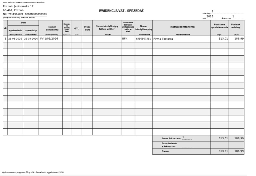 Ewidencja pobierze się w pliku PDF. Po otwarciu zobaczymy jej wizualizację - zarówno w przypadku sprzedaży