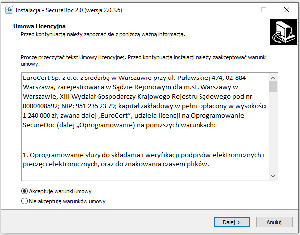 Wchodzimy na stronę https://eurocert.pl w zakładkę Oprogramowanie i klikamy w "Pobierz" przy Instalator dla systemów Windows (7 i nowsze) lub pobieramy plik instalacyjny dla systemów Mac OS X lub LINUX. Przykładowo instalacja dla Windowsa wygląda tak jak poniżej.